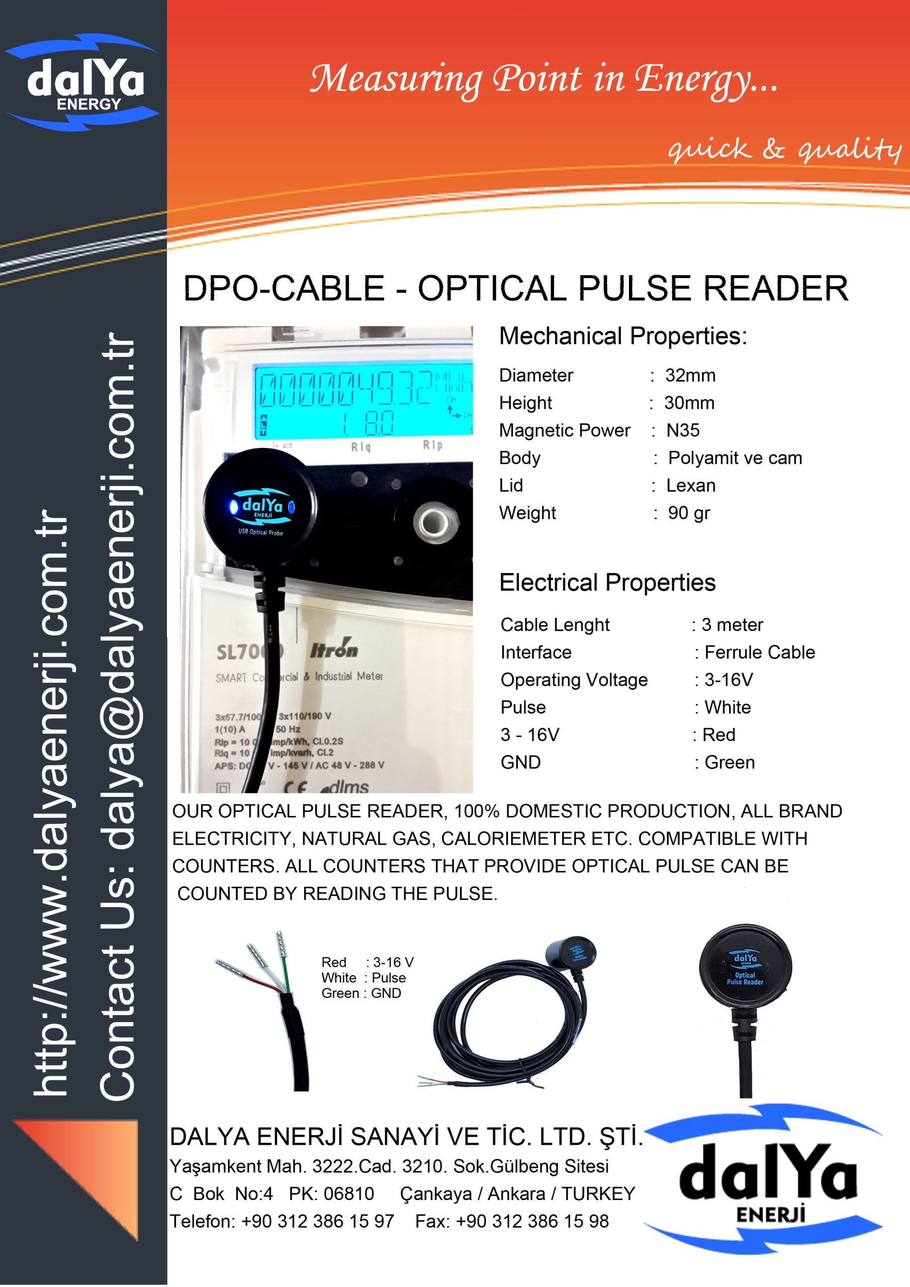 Dalya Optik Pulse Okuyucu (DPO_PULSE), tüm markaların elektrik, doğalgaz, kalorimetre ve benzeri optik pulse çıkışı veren sayaçlarıyla uyumlu olarak tasarlanmıştır. Sayaçlardan gelen pulse sinyalleri hassas bir şekilde okunur ve sayılarak veri toplama sistemlerine aktarılır.