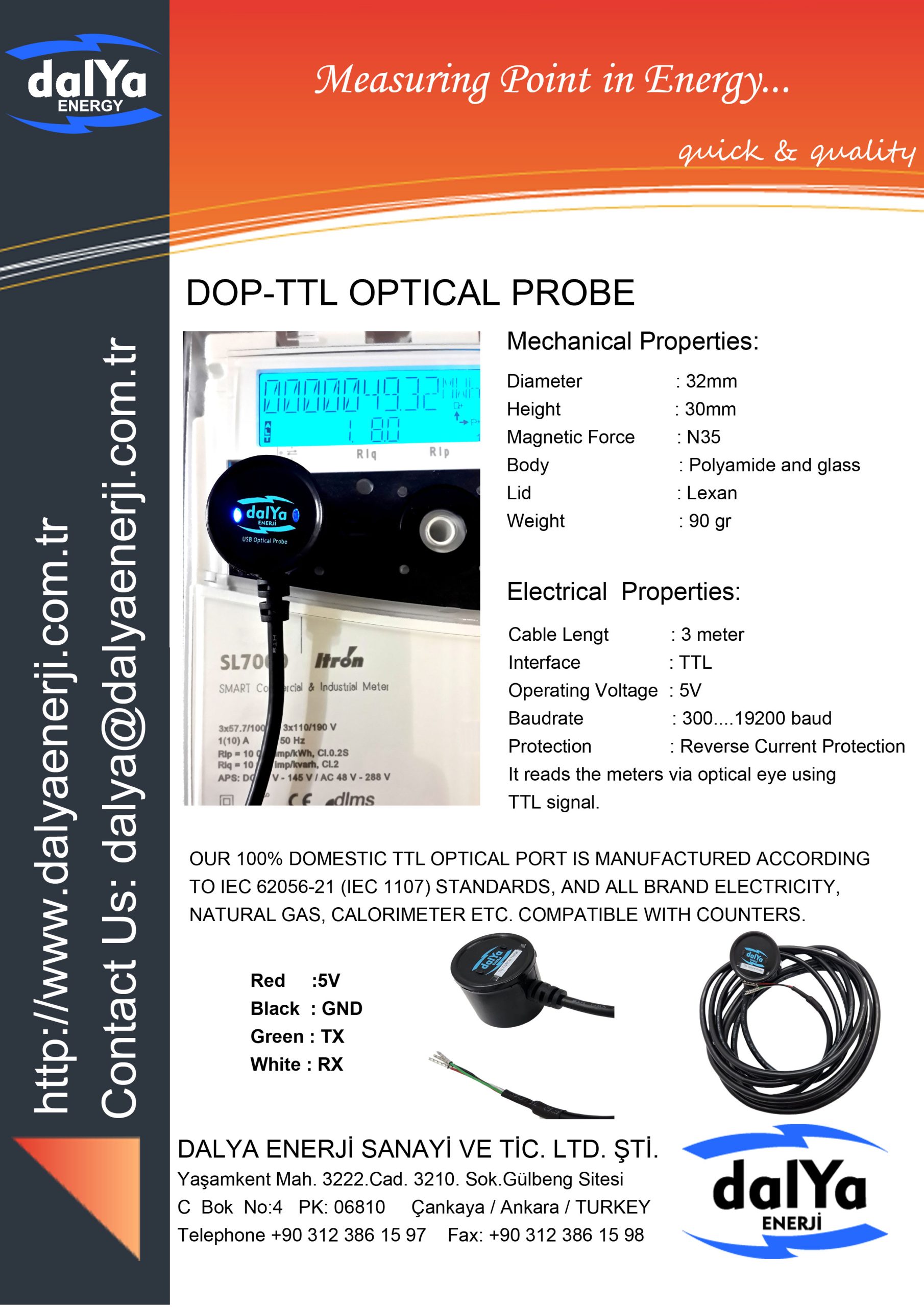 Yüksek manyetik tutuş gücü, dayanıklı gövdesi ve uluslararası standart uyumluluğu sayesinde DOP-TTL-Cable Optik Prob, sayaç okuma ve enerji yönetimi projelerinde güvenilir bir çözüm sunar.